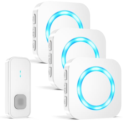 SURFOU Sonnette Sans Fil Exterieur Etanche Carillon Sonnette 300m Distance Émetteur Extérieur et 3 Récepteur Intérieur 55 Sonneries Incluant Noël 5 Volumes au LED Bleu, Blanc