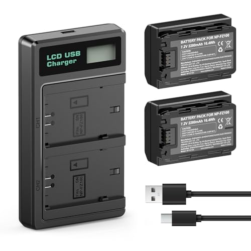 NASTIMA Lot de 2 Batteries NP-FZ100 avec Chargeur LCD, Batterie de Remplacement 2280mAh pour Sony Alpha A7 III, A7R III, A9, A7R IV, A7RV, FX3, FX30, A7iii, A7iv, A7C, A9, A6600, A6700, ZV-E10ii