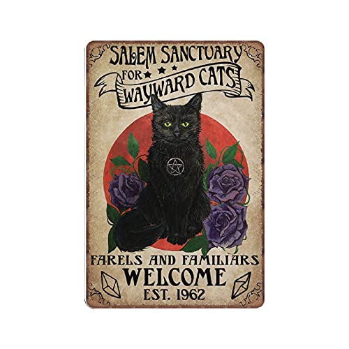 Salem Sanctuary for Wayward Cats - Plaque en étain - Impression de chat noir - Sorcière - Cadeau amusant - Vintage - Plaque en métal - Art mural - Pub - Bar - Cuisine - Jardin - Salle de bain