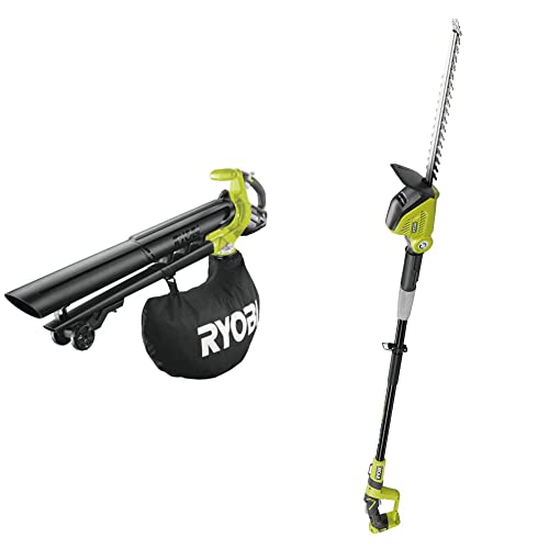 RYOBI - Souffleur Électrique sans Fil Aspiro-Broyeur à Batterie 18V One+ Brushless & Taille-Haie Électrique sur Perche sans Fil à Batterie 18V One+ - Lames 45cm pour Jeunes Haies