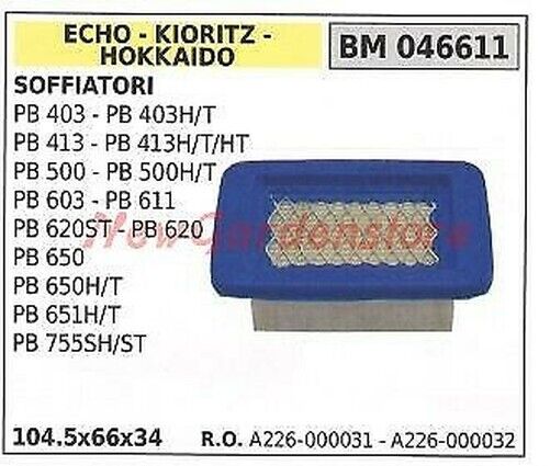 Filtre À Air ECHO Souffleur PB 403 403H/T 413 413H/T/HT 046611