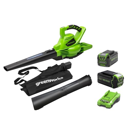 Greenworks 40V Aspirateur Souffleur sans Fil de Feuilles à Batterie avec Moteur sans Balais, 280 km/h, 9,63 m³/Min, Sac pour Mulching de 45L, Deux Batteries 4Ah et Chargeur, Garantie 3 Ans GD40BVK2X