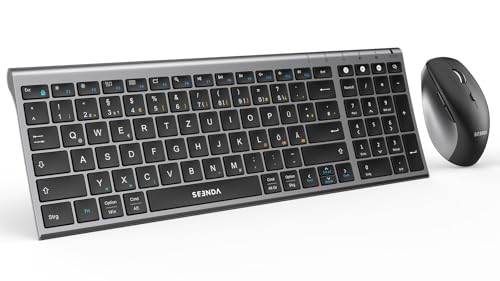 seenda Clavier Souris sans Fil - Clavier Métal Ultra Fin & Souris Silencieuse pour 3 Appareils Via Bluetooth & 2.4GHz - Disposition QWERTZ Allemande pour Windows, Mac, iPad, Android (Gris)