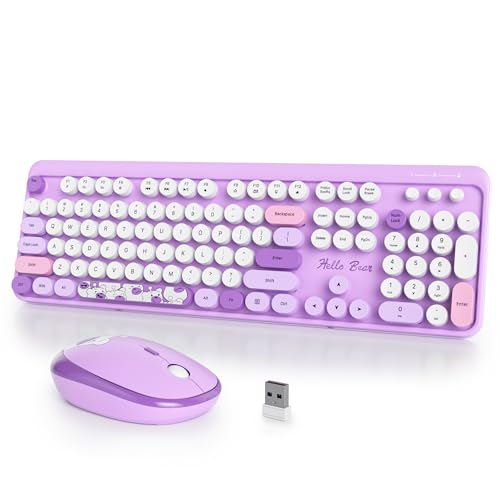 iTastatur Ensemble clavier et souris sans fil pour ordinateur portable, PC, bureau 2,4 G, 104 touches, style punk, style rétro, violet avec touches rondes (ours violet)