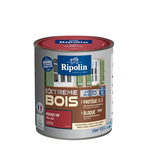 RIPOLIN - Peinture pour Bois Intérieur/Extérieur - Sans Sous-couche Ultra-couvrant - Résiste aux Intempéries, UV et Chocs - Protège et Magnifie - Lessivable - Satin - 0,5L - Rouge Vif