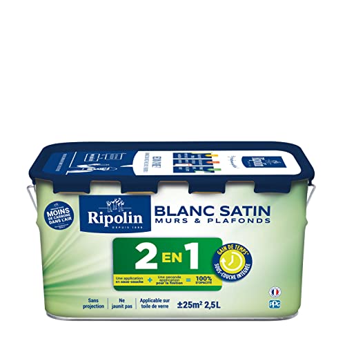 RIPOLIN - Peinture mur et plafond intérieur, 2en1 Blanc Velours 2,5L, Sans Sous-couche, Application Facile, Haut Pouvoir Couvrant, Séchage Rapide, Finition Veloutée, Idéale Pièces Sèches Et Humides