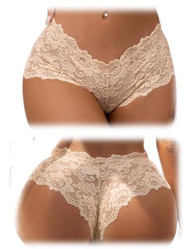 comeondear Grande Taille Tanga Sexy String Femme Chic Hot Dentelle sous-Vêtement Féminins Culottes Doublure Coton Respirante Stretch Slip Taille Basse Underwear Lot de 2 2beige,5XL