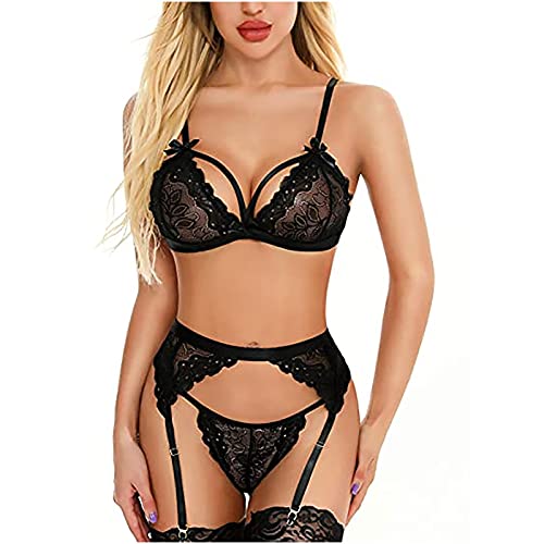 ADOSSAC Lingerie féminine 3 pièces Mode Femme Lingerie Sexy Jarretière + String Body Nuisette Transparent Tentation Broderie Dentelle Sexy Soutien-Gorge Knickers Jarretière Tentation Set
