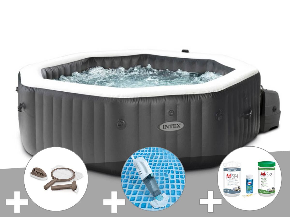 Kit spa gonflable Intex PureSpa Carbone octogonal Bulles et Jets 4 places + Kit traitement brome + Aspirateur + Kit d'entretien