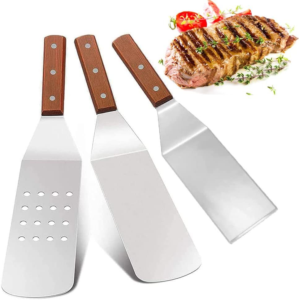 ASFASFq-3 Pièces Ensemble de Spatule en Acier Inoxydable, Spatule Plancha INOX, Spatule Barbecue INOX, Antiadhésif, Antirouille, Manche en Bois, pour Barbecue, Cuisine, Extérieur, Cuisine, Teppanyaki