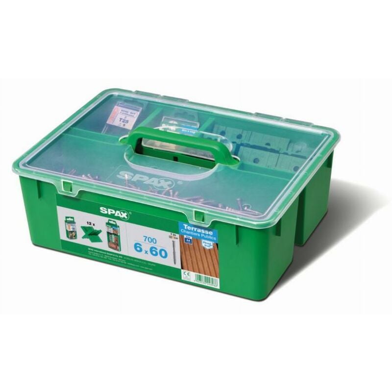 Spax - Kit fixation terrasse éxotique 6x60 Inox A2 - 700 vis + 1 foret + 12 espaceurs + 5 embouts - 5000009050009