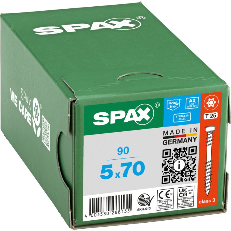 SPAX Vis terrasse, 5 x 70 mm, 90 pièces, Filetage de fixation, Tête cylindrique, T-STAR plus T25, Pointe CUT, Acier inoxydable A2 - 8000000288135