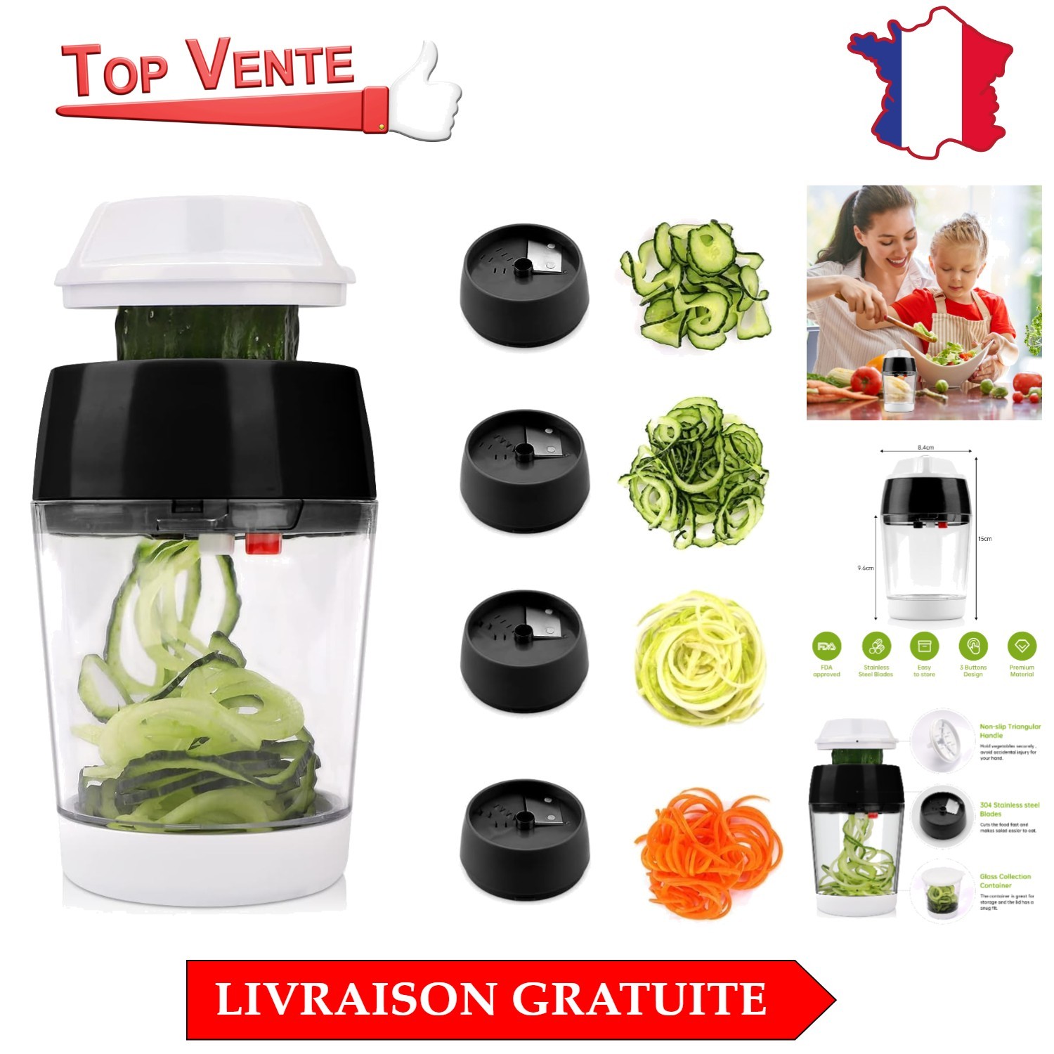Spiraliseur de légumes - Coffre-fort - 4 Lames - Coupe Spaghetti - Facile à nettoyer - Manuel