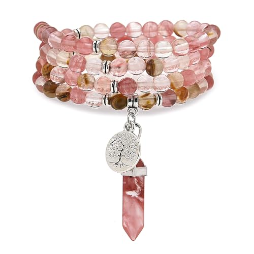 Arbre de vie charme, cadeau de bijoux faits à la main, 108 perles naturelles de marais bracelet Spirit collier avec Reiki quartz Hexagonal Prism pendentif (Tourmaline pastèque (Watermelon Tourmaline))