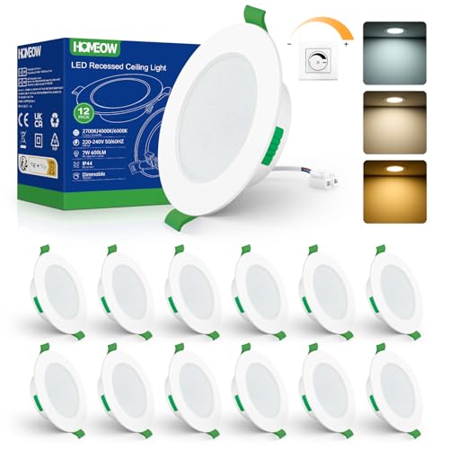 HOMEOW Spot LED Encastrable Dimmable 7W, 220V Spots de Plafond Extra Plat, Spot Salle de Bain IP44, Reglable Blanc Chaud 2700K Blanc Neutre 4000K Blanc Froid 6000K, Trou Φ75-90mm, Lot de 12