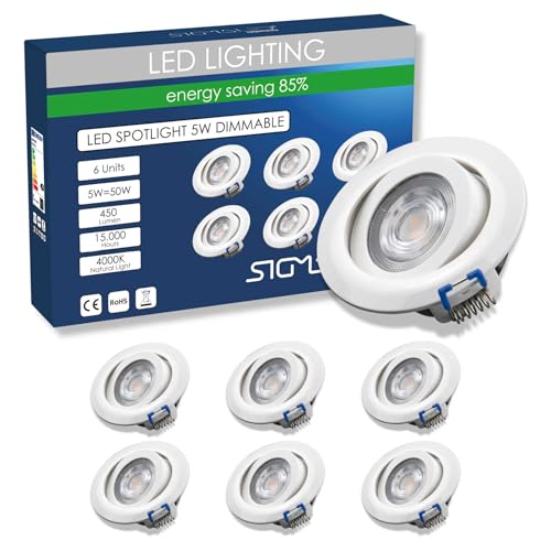 Sigmaled lighting, 6 Spots LED Encastrables, 5W dimmable, 450 lm, lumière Neutre 4000K, SPOT LED de Plafond Orientable, Extra Plat, Gradable, cuisine, salon, intérieur, 220V 230V, trou Ø 70-80 mm