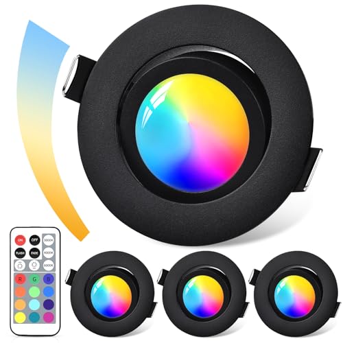 GeyouLux Spot LED Encastrable Dimmable RGB, IP44 Aluminium Spot LED 230V 68mm, 5W 3CCT, Orientables 120°+45° Spots de Plafond Noirs avec Télécommande IR pour Salle de Bain, 4 Pièces