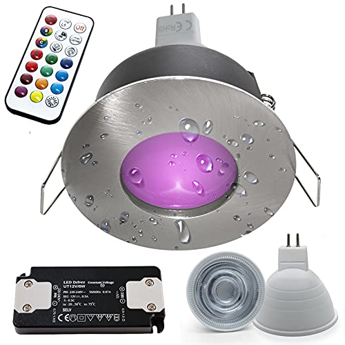 Planetitaly Spot encastrable LED 6 W 12 V chromothérapie IP65 pour cabine de douche, salle de bain, hammam, lampe GU5.3 RGB 3000 K 6000 K, télécommande IR (Couleur Argenté Brossé, Lumière RGBW+3000 K)