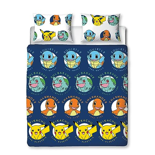 Character World Pokémon Parure de lit Double Officielle Gotta Design | Bleu réversible Pikachu Squirtle Charmander Housse de Couette 2 côtés Produit Officiel avec taies d'oreiller Assorties