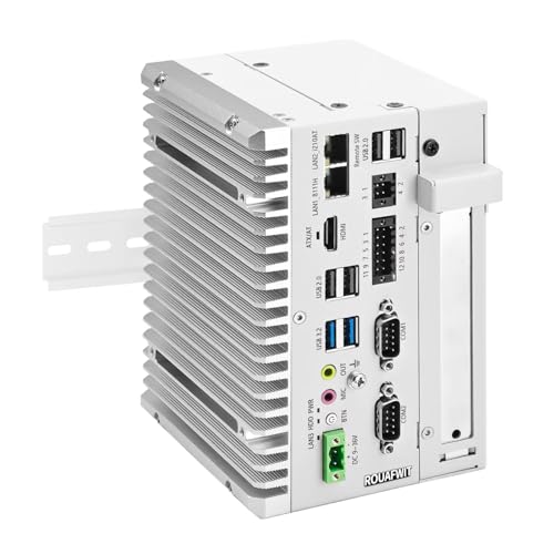 ROUAFWIT Mini PC Industrial Fanless Embedded Computer i5 8265U Dual LAN 2RS232COM DIN Rail PC 8Pin GPIO 4USB 4K Dual Display Auto Power on DDR4 0G RAM 0G SSD, 1 x PCIe x1 Slot, Win 11 Pro