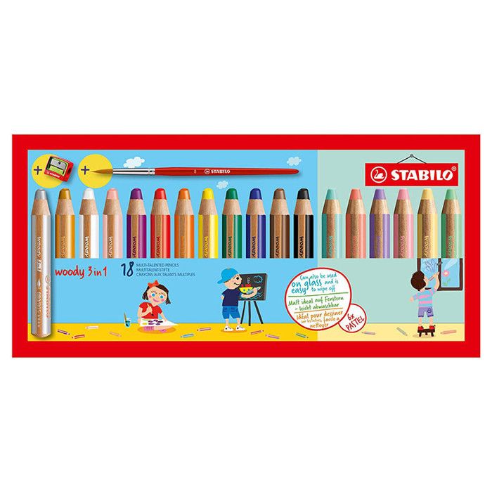 Etui carton de 18 crayons de couleur STABILO woody 3 in 1 + 1 taille-crayon + 1 chiffonnette