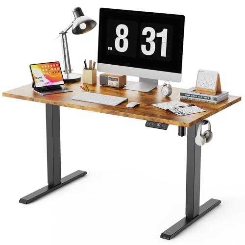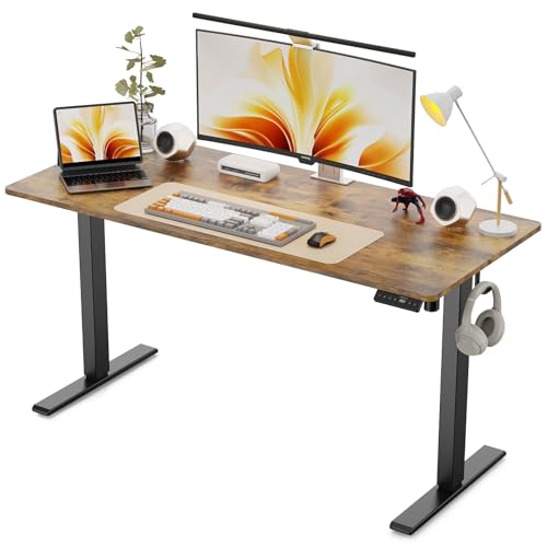 FIVMEN Bureau à hauteur réglable électrique,Bureau d'ordinateur réglable Standing Desk,crochet pour casque d'écoute pour bureau (brun vintage, 140 x 60 cm)