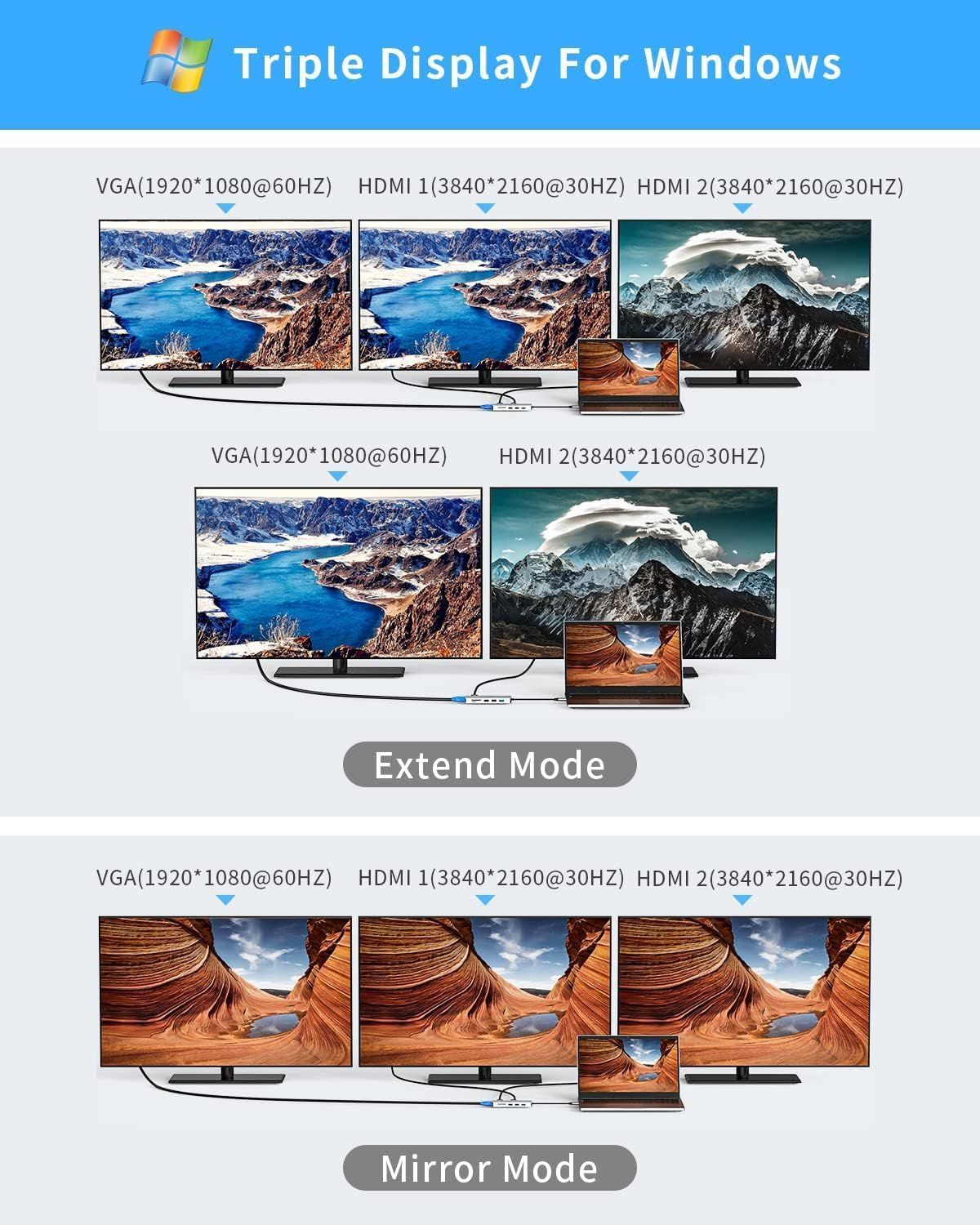 Hub USB C 9 en 1, Triple écran, 2 Ports HDMI/VGA, Mac Pro/Air Station d'accueil pour Dell, Surface, HP, Lenovo, appareils de Type C (SD/TF+USB A 3.0/2.0 + PD Recharge)