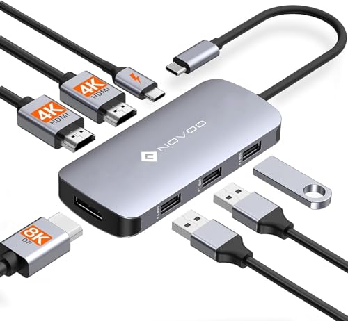NOVOO 7-en-1 Docking Station Double Moniteur, Hub UBS C vers 2 HDMI 4K, Displayport 8K, 100W PD, USB x 3, Triple Affichage Station d'accueil pour Dell, HP, Lenovo, ASUS, Microsoft