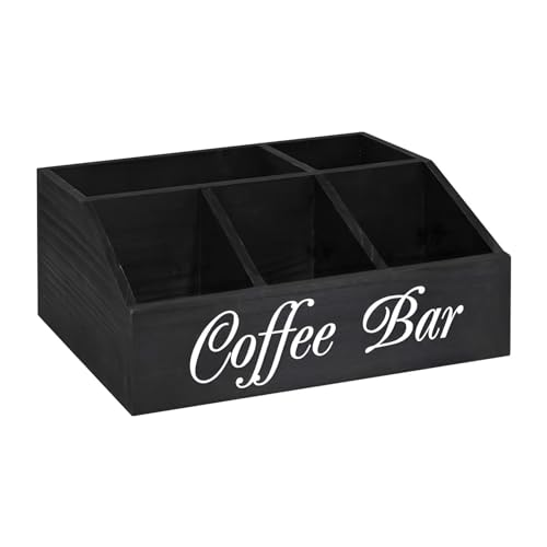 Organisateur de Café, 5 Compartiments Boîte de Rangement pour Accessoires de Bar à Café, Organisateur de Café en Bois Vintage, Station de Café et Sachets de Thé pour Lait, Serviettes, Capsules(Noir)