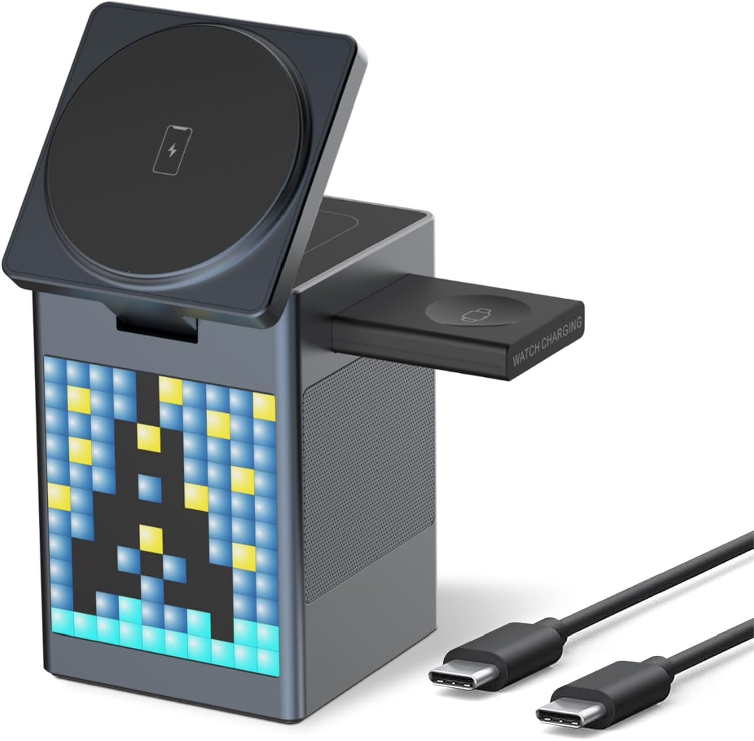Brightlink Chargeur Induction 3 En 1 Compatible Iphone, Apple Watch Et Airpods - Station De Charge Magsafe Avec Enceinte Bluetooth, Horloge Réveil Et Animations Pixel - Chargeur Magsafe Pour Apple