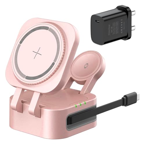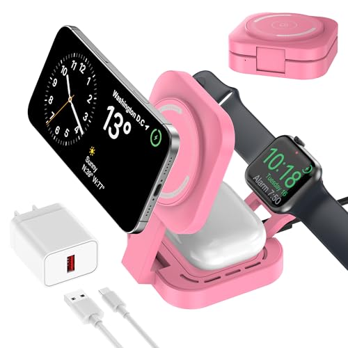 Chargeur Induction 15W 3 en 1 pour iPhone 17/16/15/14/13/12 Pro/Max/Plus, Chargeur Magsafe Station de Charge Apple Watch 11/10/9/8/Ultra 3/7/6/SE 3, Chargeur sans Fil Rapide, Rose