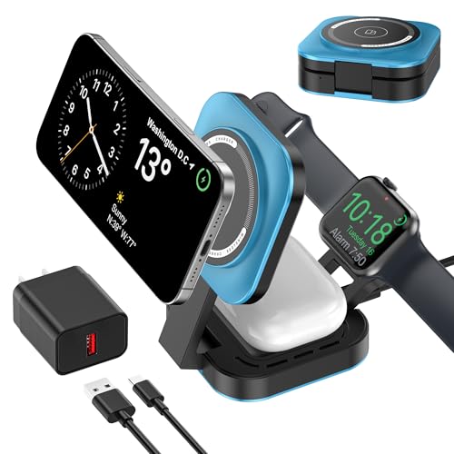 Chargeur sans Fil 3 en 1 pour appareils Apple, Chargeur Induction, 3 en 1 Station de Charge Rapide pour Magsafe iPhone 17/Air/16/15/14/13/12, Apple Watch, AirPods Pro/2/3/4 (Adaptateur Inclus) (Bleu)