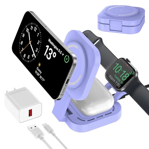 Chargeur sans Fil 3 en 1 pour appareils Apple, Chargeur Induction, 3 en 1 Station de Charge Rapide pour Magsafe iPhone 17/Air/16/15/14/13/12, Apple Watch,AirPods Pro/2/3/4 (Adaptateur Inclus) (Violet)
