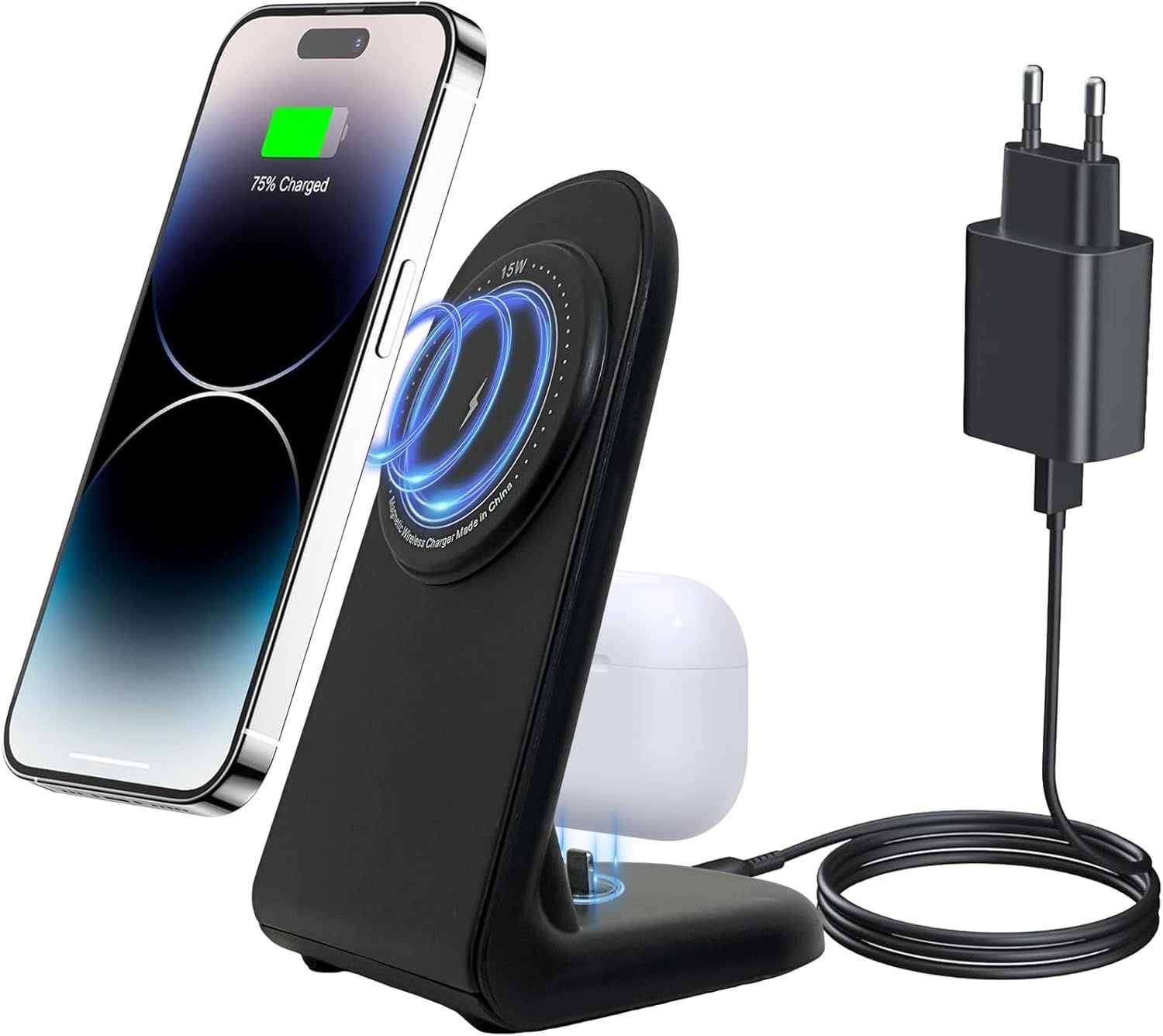 Station de charge inductive Mag-Safe 2 en 1 - Chargeur sans fil - Support de charge pour iPhone 16/15/15 Plus/15 Pro/15 Pro Max/14/13/12, AirPods 3/2/Pro 1 - Chargeur de téléphone portable sans fil