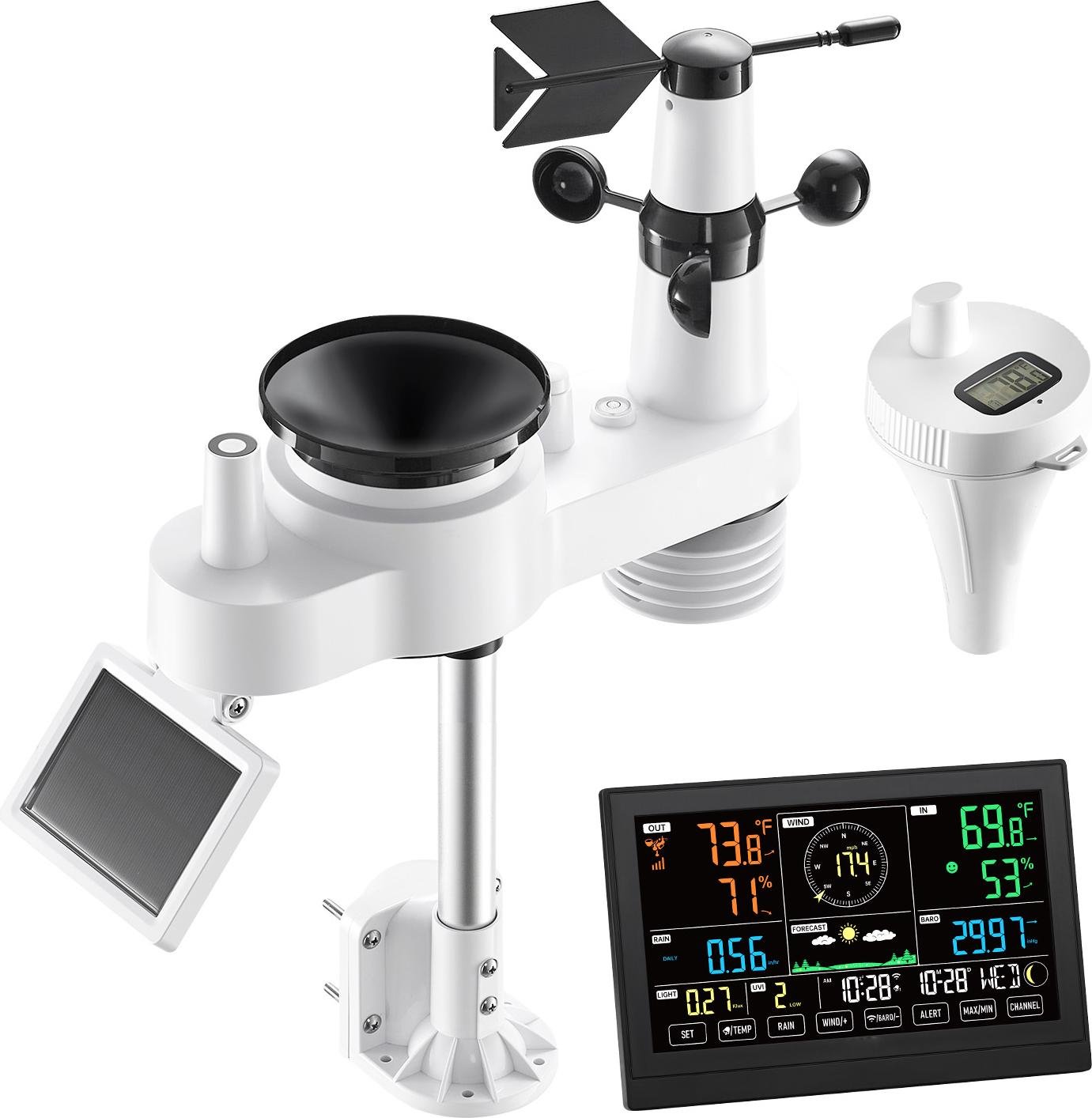 SucceBuy Station météo WLAN 7 en 1 avec APP, écran 7,5 pouces, capteur extérieur à énergie solaire, y compris thermomètre de piscine, pluviomètre, centre météo pour prévisions, mesure du vent et température de la piscine