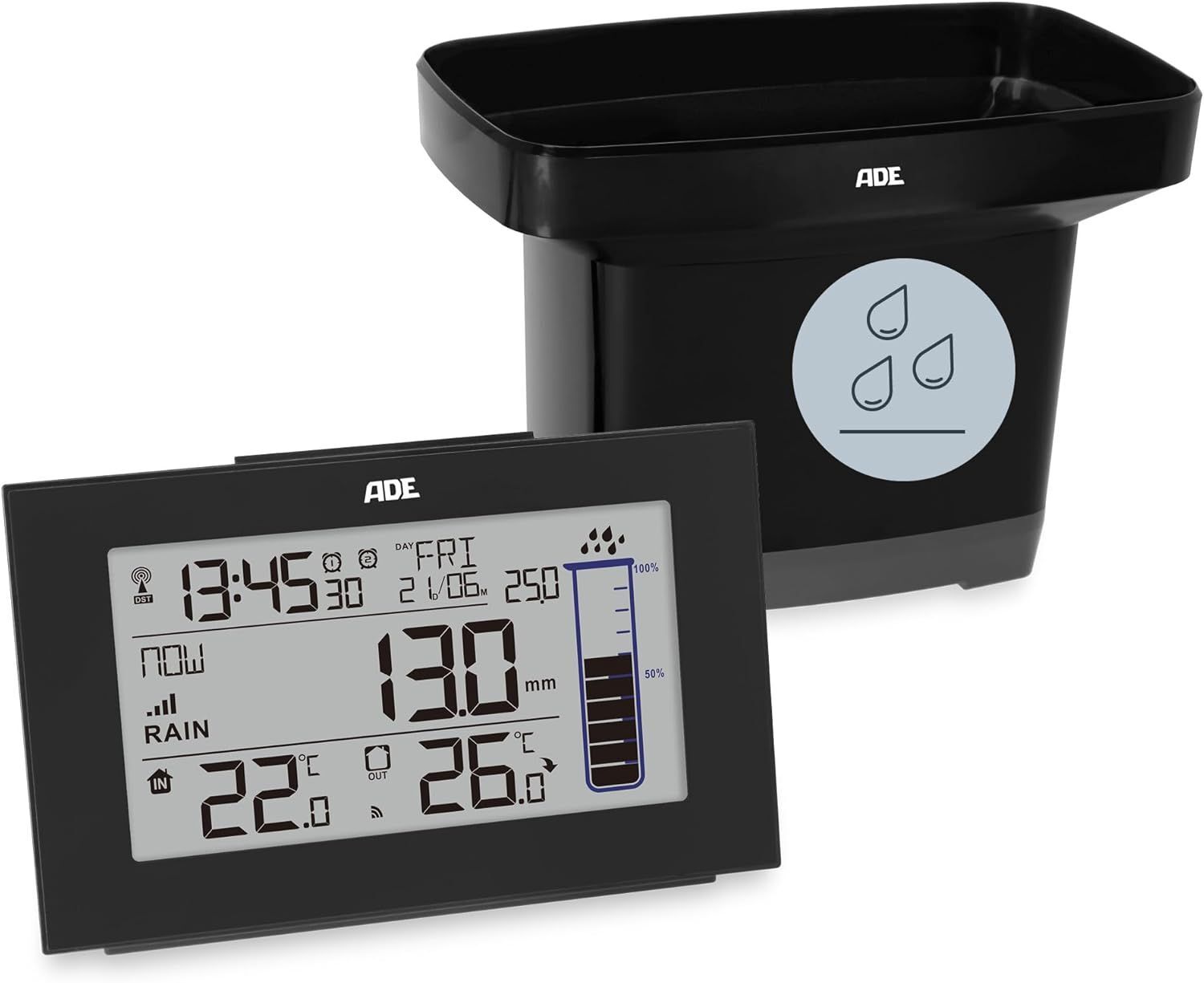 ADE Pluviomètre exterieur jardin | resistant au gel | station météo avec thermomètre interieur et exterieur sans fil | horloge radiopilotée avec 2 heures de reveil | affichage de la date | piles incl.
