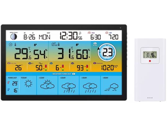 Optex – Station météo couleur radio contrôlée – Capteur extérieur avec chargeur USB – Affichage température, humidité, pression – Écran rétro-éclairé
