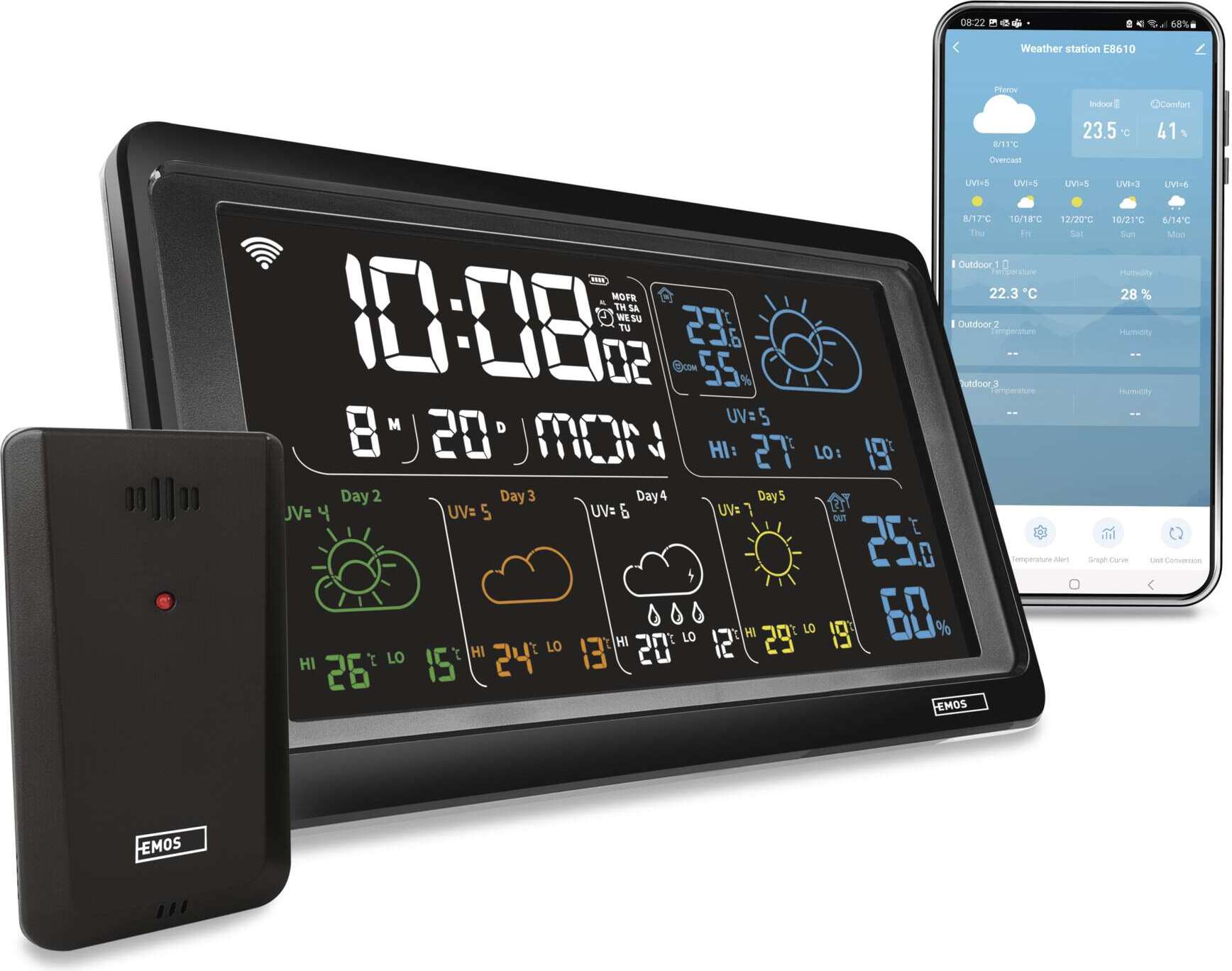 EMOS GoSmart Station météo WiFi avec capteur extérieur radio et app, écran couleur, prévisions météo sur 5 jours ; Tuya, compatible Smartlife, adaptateur secteur inclus, E8610