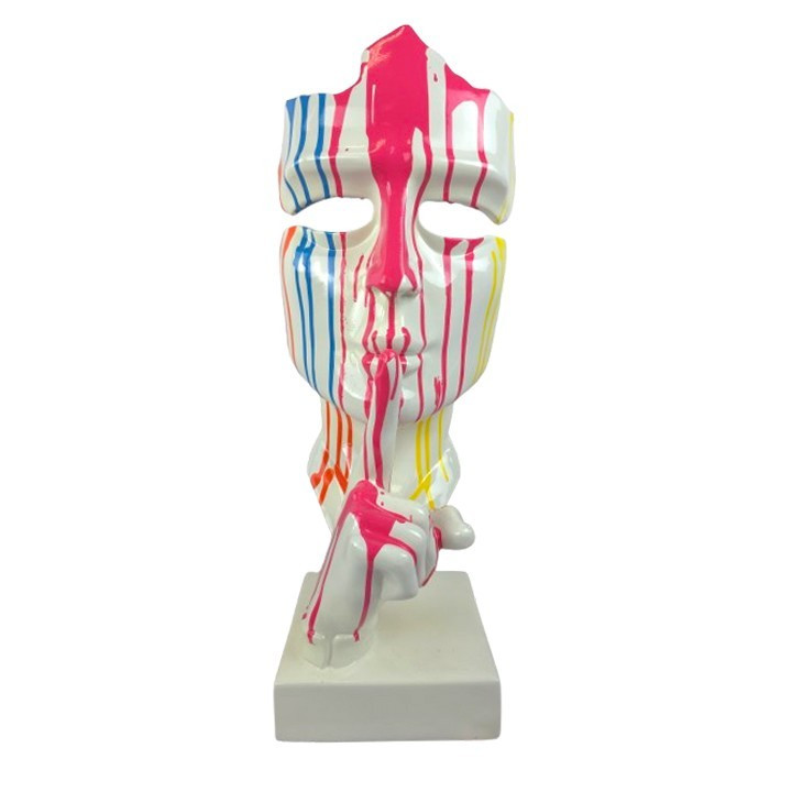 Statue en résine sur socle visage de femme multicolore sur fond blanc le signe d