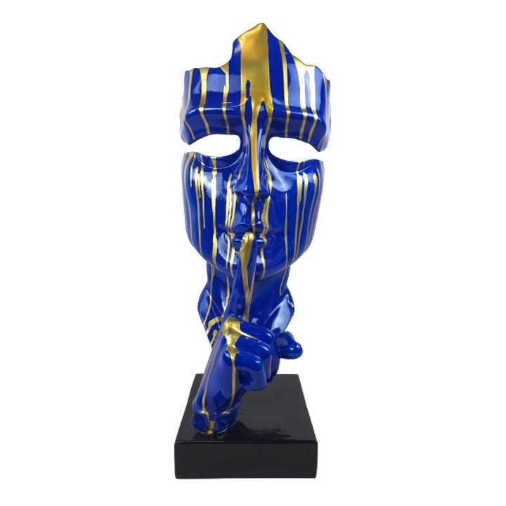 Statue en résine sur socle visage de femme bleu et doré le signe du silence 43 c