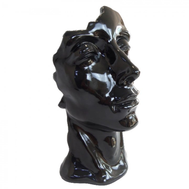 Statue en résine sur socle visage de femme multicolore doré sur fond noir le sig