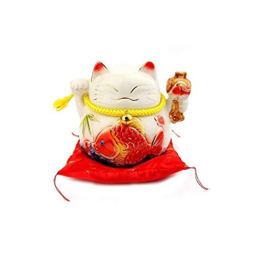 lachineuse - Statuette Maneki Neko Motif Relief - Symbole Fortune dans la Maison - Chat Japonais Porte-Bonheur - Déco Poissons - Porcelaine - 15,5 x 18 x 15 cm - Blanc - Idée Cadeau Japon Asie
