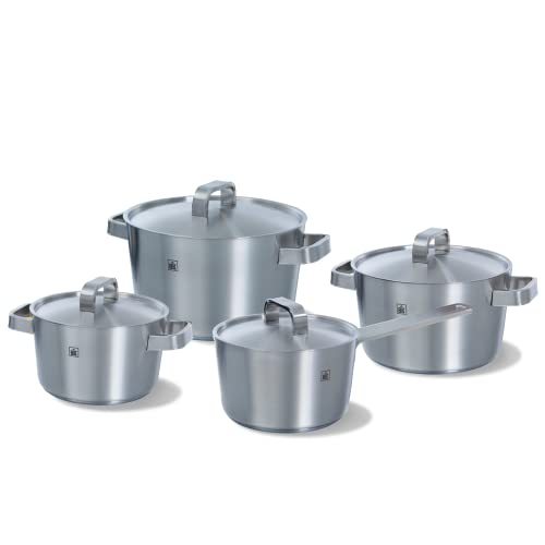 BK Conical+ Set de 4 Casseroles en Acier Inoxydable Brossé avec Couvercles, Adapté à l'Induction, Four et Rôtisserie jusqu'à 230C, Lavable au Lave-Vaisselle, Poignées Stay-Cool, Sans PFAS, Argent