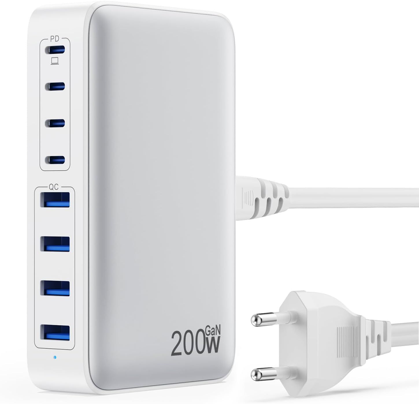 JGD-200W Chargeur USB C, Chargeur Rapide avec GaN III Tech, 8 Ports PD QC PPS Prise Multiple, 65W Adaptateur Chargeur Laptop Compatible avec MacBook Pro/Air Laptop, iPhone, iPad Pro, Galaxy, SteamDec