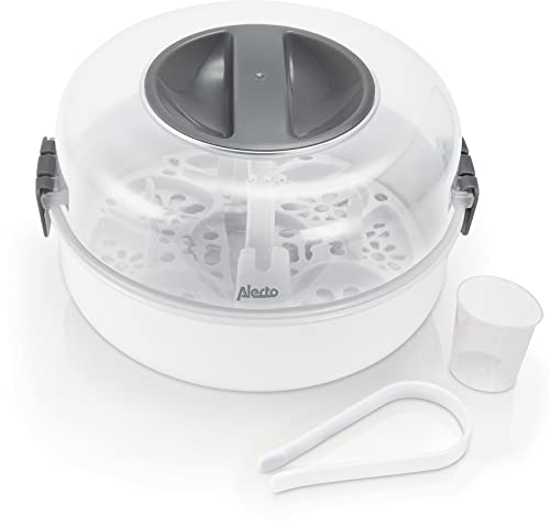 Alecto Stérilisateur à micro-ondes BW-04 pour jusqu'à 4 biberons de 150 ml, tire-lait, pots, tasses et couverts - Avec pince à biberon, blanc