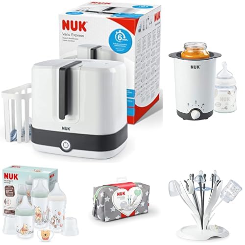 Bundle of NUK Vario Express Stérilisateur de biberons + NUK Thermo 3 en 1 Chauffe-biberon + NUK Multi Dry Egouttoir Biberon + NUK Trousse de Soin Bébé avec Sucette + Set de biberons NUK Perfect Match