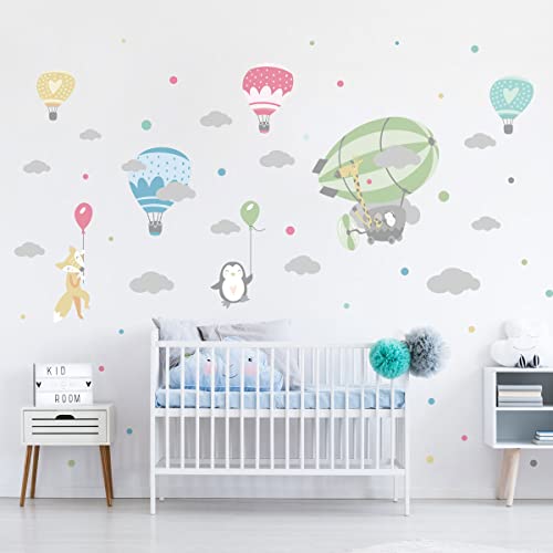 Stickers muraux enfants - Decoration chambre bébé - Sticker mural chambre enfant - Autocollant mural animaux et montgolfières dans les nuages - H90 x L60 cm