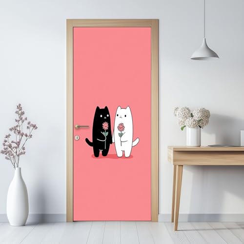 Mignons Chats Couples Sticker Porte Trompe l'oeil Effect 3D Intérieure Muraux PVC Stickers pour Décoration Mur Salon Cuisine Chambre Salle de Bain Papier Peint, 95 x 215 cm, Rose