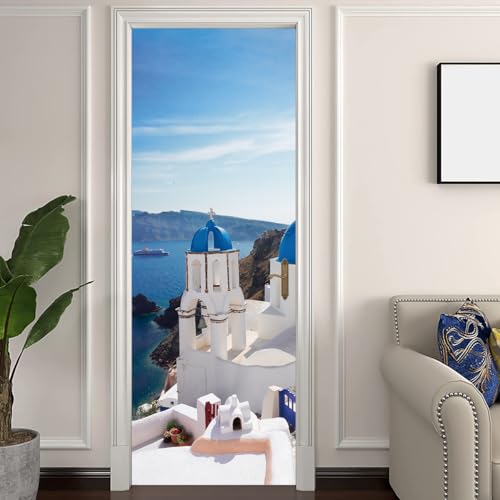 3D Papier Peint Porte Trompe l'oeil Sticker Poster Porte Trompe l'oeil Intérieure Muraux PVC pour Décoration Mur Salon Cuisine Chambre Salle de Bain 83x204 cm L 'île Santorin