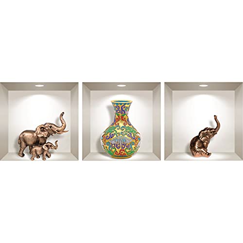 Stickers adhésifs 3D | Sticker Mural Autocollant effet 3D éléphants et vase ancien - Stickers muraux Chambre Adulte - Stickers muraux 3D - Déco Salon - Autocollants muraux Trompe l'oeil | 40x120cm